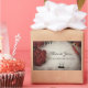 A sticker which says "thank you for celebrating with us" with an autumn floral themed photograph. Faded lined writing paper and some pretty red flowers and green leaves placed around the edges. Thank you written in a black handwritten elegant font. A silhouette illustration of a pair of wineglasses and grapes sits at the bottom.