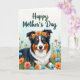 This card features a friendly tri-color dog centered in the design, with black, white, and warm reddish-brown fur and bright amber eyes that seem to meet yours with an affectionate, welcoming look ❤️. Its mouth is open in a happy grin, showing a small peek of pink tongue, which adds to the easygoing, companionable mood. A crown of orange flowers and green leaves sits across its head, like a sweet gesture someone might make for a cherished friend. The background suggests a sunlit meadow with soft green grass and a gentle, hazy blend of pale green and sky blue behind it. In the foreground, scattered wildflowers in coral, orange, and calm blue create a natural frame around the dog, hinting at a shared stroll through springtime 🌼. Near the top, a short greeting appears in dark green lettering, placed above the dog’s head so it reads first without covering the face. The orange blossoms in the crown stand out against the softer, misty background, while small blue flowers dot the lower area like tiny accents near the grass line.