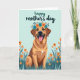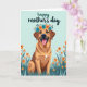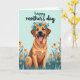A warm message of a light-brown dog with a friendly, open-mouthed grin looks straight ahead, its pink tongue showing as if it’s leaning in for affection ❤️. A crown of blue and orange blossoms with small green leaves sits across its head, framing dark, gentle eyes that feel devoted and sweet. The dog rests in a field of teal grass, where thin stems rise up with orange, tulip-like flowers that add a cozy, companionable mood. Behind everything, a soft mint-green background keeps the scene calm and airy, like a quiet moment shared together. Near the top, a short message appears in dark green, flowing lettering, centered above the dog’s head. The simple shapes and smooth outlines keep the focus on the dog’s warm expression and the tender, garden-like setting 🌼. Earthy browns, cool blues, and bright oranges balance each other across the illustration. The upper text sits above the floral crown, while the teal grass and orange blooms fill the lower half of the design.