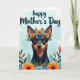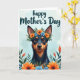 Designed with a tender, celebratory feel, the artwork centers on a friendly dog with sleek dark fur and warm tan markings, looking outward with soft amber eyes that feel like a quiet ❤️. A gentle curve in its muzzle reads like a small smile, adding to the sense of closeness as if it’s sharing a private moment with the viewer. A floral crown rests between its alert ears, made of orange and pale blue blossoms tucked into green leaves, like a thoughtful gift placed with care. More flowers and leafy sprigs rise from the lower edge and curl in from the sides, creating a natural frame that feels like an embrace. The background is a diffused sky-blue with a faint cloud-like texture that keeps the scene calm and airy 🌼. Across the top, a flowing calligraphic message arches in a darker tone, standing out clearly against the light background. The dog’s rich earthy colors contrast with the cool blues and bright oranges, and the bottom corners show clustered petals and foliage reaching inward.