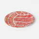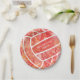 These cute volleyball themed paper party plates have a red color theme with pink and gold accents and feature the outline image of a simple volleyball - a doodle pattern of paislies, flowers and feathers in white covers all but one of the volleyball's textured-look panels - personalize with your message - by katz_d_zynes