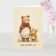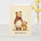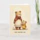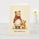 This design shows two gentle, bear-like characters standing close together on a creamy beige background, their soft faces turned toward each other with a tender, caring look ❤️. The taller figure stands slightly left in a light cream dress, with a narrow band of small floral shapes in earthy reds and yellows along the lower edge. A warm, reddish-brown shawl wraps around its neck, adding texture and a cozy, protective feel. On the right, the smaller figure wears an ochre dress and a matching looped scarf, leaning in as one paw rests lightly against the taller figure’s dress in a quiet sign of closeness. A small scarlet bow sits near the smaller figure’s ear, echoing the tiny red blossoms scattered near their feet 🌼. The text is placed below the illustration in a soft, medium-brown tone, centered and easy to read against the pale background. Underfoot, thin sprigs of green and a few crimson flowers dot the ground, with gentle watercolor-like shading and a faint blush on both cheeks.