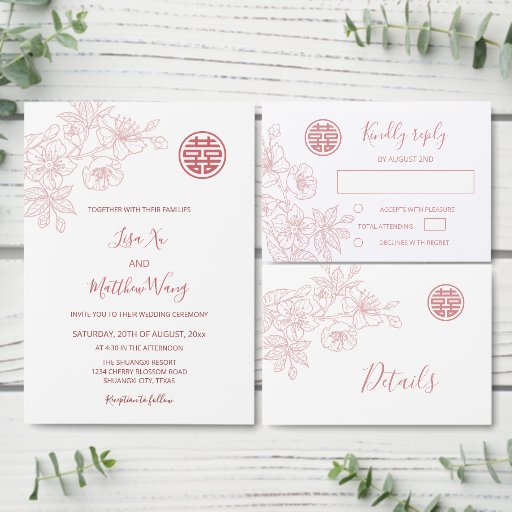 This modern Chinese wedding thank you card features dusty rose double happiness symbol and dusty pink line art flowers on a white background. Bride and groom names in an elegant handwritten script. Chinese wedding invitation or tea ceremony invitation available.