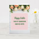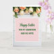 This card features a soft pastel pink rectangle set on a lightly textured white wooden surface, with gentle lighting that softens every edge. Along the top border, a loose garland of roses in creamy white and pale peach rests among green leaves, like a sweet gesture placed with care 🌷. The flowers frame the message the way close family might gather around a couple, hinting at affection through the calm, close arrangement. Centered on the card, the words “Happy Easter” appear in dark green cursive-style lettering, slightly larger than the rest. Beneath it, “FOR MY GRANDSON AND HIS WIFE” is set in dark green, all caps, in a simple sans-serif font, aligned to the center and spaced neatly. The color pairing of pink, green, and soft floral tones creates a tender, romantic mood without needing extra decoration 🐰. Fine wood grain lines run horizontally behind the card, and the rose petals show subtle shading from cream to peach near their edges.