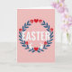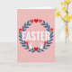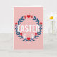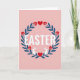 This design shows a circular wreath of blue‑green leaves and small red blossoms set against a soft pastel pink background, with a gentle paper-cut shadow that adds depth. Centered inside the wreath, the word “EASTER” appears in bold white letters, standing out clearly against the warm backdrop. Small crimson hearts are tucked among the leaves, giving the arrangement a sweet, affectionate tone without needing extra fuss. At the bottom curve of the wreath, two white long‑eared rabbits 🐇 face inward toward each other, their close placement suggesting a tender bond like close friends sharing a quiet moment. Between them sits a tiny red heart, acting like a little focal point for their shared gaze 🐰. The colors stay mostly to pink, white, red, and blue‑green, keeping the look simple while still lively. The lettering remains centered and bright, while the wreath wraps evenly around it like a gentle frame. Fine shadowing under the leaves, flowers, hearts, and rabbits makes each shape look slightly raised from the pink surface.