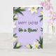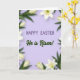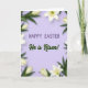 This card opens on a soft lavender background with a gentle, romantic calm, like a quiet spring morning shared with someone close 🌷. Centered near the top, the words “HAPPY EASTER” appear in a neat, slightly raised-looking sans-serif style in a light purple tone. Just beneath it, “He is Risen!” is written in flowing, decorative lettering in emerald green, giving the message a tender, uplifting lift. Around the edges, a softly blurred frame of white blossoms and green leaves leans inward as if cradling the text, creating a cozy, affectionate focus. Some flowers are fully open with tiny golden centers, while others are still in bud, adding a gentle sense of new beginnings. The mix of lavender, white, and deep green feels like a spring bouquet offered with quiet care, with the floral corners guiding your eyes back to the words 🐇. The border stays soft and misty, with clusters of blooms and foliage gathering in the corners and fading lightly along the sides.