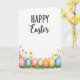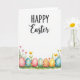 This card features a spring scene with lots of open white space, keeping the layout airy and easy on the eyes. At the top, the word “HAPPY” appears in black, all-caps lettering, and “Easter” sits just beneath it in a flowing black cursive style. Along the bottom runs a soft watercolor strip of green grass, like a little meadow edge. Nestled in the grass is a neat row of decorated egg shapes, arranged close together the way friends might line up for a photo, with a gentle, cozy closeness. Each egg shows its own pattern—tiny starbursts, curling flower shapes, stripes, and dotted details—in soft pink, sky blue, sunny yellow, and warm orange, with a couple 🌷 tucked between blades of grass. Small wildflowers in pink, yellow, and coral peek up around the eggs, adding a sweet, affectionate touch to the scene. The grass looks brushy and layered, with thin green strokes and scattered blossoms, and a little 🐰 could easily be imagined just out of frame.