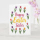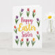 This card features the words “Happy Easter Sister” centered on a white background, with “Happy” and “Sister” in bright fuchsia and “Easter” in sunny yellow. The lettering has smooth, flowing strokes, giving the greeting a friendly, close-to-the-heart look, as if written for someone you truly know. Around the text sits an open, uneven oval made from twelve spring flowers, like a loose wreath that leaves breathing room for the message. The blossoms are painted in a soft watercolor style with slightly see-through petals and feathered edges, creating a gentle, affectionate mood 🌷. Colors move through purples, coral oranges, rosy reds, and bright yellows, with each flower attached to thin green stems and small leaves. Subtle shifts in pigment make the petals look naturally varied, like they were brushed on with a light touch. The floral ring is irregular rather than perfectly symmetrical, with the flowers spaced in a way that curves around the words while leaving a small gap near one side 🐰.