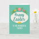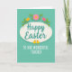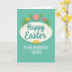 Designed with a cool teal background and warm spring tones, this card centers on a creamy white oval that feels like a gentle spotlight for the message. Above the oval, a curved spray of stylized flowers adds a friendly, affectionate touch, with yellow tulip-like buds and soft pink blossoms that seem to lean toward one another like close friends 🌷. The blooms connect through green stems and leaves, and a light shadow underneath gives the arrangement a layered look. Inside the oval, “Happy Easter” sits prominently in a flowing teal lettering style that matches the background color. Beneath the greeting, two small yellow baby birds face each other with tiny orange beaks and feet, their close stance suggesting a tender little chat. Under the oval, the line “TO OUR WONDERFUL TEACHER” appears centered in white, simple lettering that stands out clearly against the teal. The final detail is the soft drop shadow that sits just under the oval and flowers, subtly lifting them off the flat teal field 🐰.