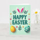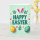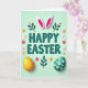 This greeting card features a spring holiday design on a mint-green background, with “HAPPY EASTER” centered in deep teal capital letters that look like layered paper with soft shadows. Above the words, a pair of curved white bunny ears with bright pink inner sections sits near the top edge, adding a sweet nod to 🐰. Around the main text, small flowers in white, orange, and pink mingle with thin dark-green leafy sprigs, arranged like a gentle frame that feels friendly and close. The shadows under the letters, ears, and flowers give everything a slightly raised look, like pieces placed carefully side by side. Near the bottom, two glossy egg shapes anchor the layout, almost like a pair set together for a shared celebration between friends 🐇. The left egg is golden yellow with neat white polka dots, while the right egg is rich teal with white daisy-like flowers in a few different sizes. “HAPPY” sits above “EASTER,” both in the same deep teal color, centered between the ears and the eggs. Tiny blossoms and leafy sprigs cluster around the words, and the two decorated eggs rest along the lower edge against the mint-green field.