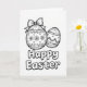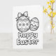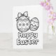 This card features two decorated eggs drawn in black outline on a white background, set close together like friendly companions 🐰. The larger egg on the left wears a neatly tied bow at the top, and the bow’s fine hatching gives it a soft, rounded look. Across the egg are tidy rows of small circles and three simple flower shapes, arranged symmetrically like careful decoration shared between two people. To the right, a slightly smaller egg leans in visually with wavy lines and one thick horizontal band, creating a gentle contrast that still feels connected 🐇. Subtle shading lines along both eggs add a touch of depth, as if they were lightly textured and ready to be colored in. Centered beneath the eggs, the words “Happy Easter” sit in a thick, rounded letter style in black, taking up the lower portion of the design. The bow sits at the top-left egg’s crown, with the patterned flowers and dotted rows clearly visible above the “Happy Easter” text.