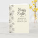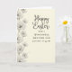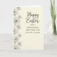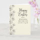 Designed with a warm, creamy background that looks like softly aged stationery, this greeting card features a vertical border of stylized flowers along the left side in muted grayscale tones. Each blossom is shaded with fine petal detail, and the gentle spacing between blooms gives the layout a calm, intimate rhythm, like a quiet walk together 🌷. Near the center-right, the main Easter greeting sits large in a flowing, cursive-style lettering, while a smaller dedication line appears beneath it in a neat serif font. The headline text is a darker gray for clear contrast, and the smaller line is slightly lighter, keeping the focus on the main message. Tucked among the lower flowers are a few crisp white bird shapes made from simple geometric folds, positioned close together as if sharing a tender moment 🐇. Soft, diffused lighting keeps the edges smooth and the tones even, with the left floral border guiding the eye downward. At the bottom left, the pale petals frame the small white birds, which sit just above the lower edge beside the final cluster of blooms.