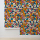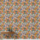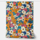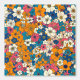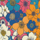 This artwork bursts with a dense and lively arrangement of vibrant flowers, creating a rich tapestry of colors and shapes. The floral motifs are rendered in bold shades of orange, blue, pink, and white, interwoven with delicate line work that adds detail and texture. The overlapping petals and varying sizes of the flowers give the design depth and energy, evoking a sense of abundance and celebration. The composition is both playful and intricate, with a dynamic balance of color and form.