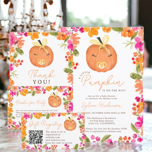 A little pumpkin is on the way! Celebrate your baby shower this fall autumn cute orange baby pumpkin with a pacifier and floral watercolor frame with bright pink and orange flowers gift registry baby shower.