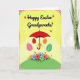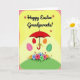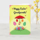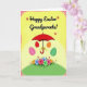 Designed with a sunny spring scene, the card centers on a bright red umbrella with a curved handle wrapped in a golden ribbon. From beneath the canopy, four pastel egg-shaped forms with delicate patterns drift downward, as if being gently guided into place 🐰. The background shifts through warm yellow tones, giving the setting a light, friendly glow that feels like a shared moment between close friends. A dotted border runs around the edges, adding a cheerful frame without crowding the artwork. At the bottom, a rounded green hill holds a clustered garden of small flowers in pink, blue, green, and orange, with leafy accents that lean toward one another like a quiet, caring gesture 🌷. Near the top, a short greeting sits centered in a dark ink tone, with tiny floral marks tucked around the letters. The umbrella’s red canopy sits above the patterned eggs, and the polka-dot border encloses the yellow gradient background on all sides.