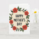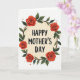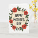 This card features the centered, black, sans-serif words “HAPPY MOTHER’S DAY” set inside a softly uneven pale-cream oval on a white background. A thin earthy-brown vine traces the oval’s edge like a gentle embrace, giving the message a cozy, close-to-the-heart feel ❤️. Deep green leaves branch outward around the frame, their slight texture making them feel fresh and living, like a quiet garden moment shared together. Five red-orange flowers sit among the leaves, with curled, swirled petals that look as if they were brushed on with care and affection. Small dots in red-orange and soft yellow are sprinkled around the oval and across the white space, like tiny confetti drifting through the air 🌼. The main text stays centered within the oval, while the wreath forms a rounded border that keeps everything gathered in one loving scene. The red-orange blossoms stand out against the cream center and white background, with the dotted accents floating lightly in the open areas around the wreath.