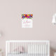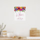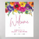 A colorful summer baby shower welcome sign. This design features a large top boarder of vibrant watercolor flowers in purple, pink, yellow and orange, and "welcome" in dark pink modern handwritten style font. Personalize with your details.