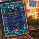 Infused with the heart and soul of Mexican folk art, this colorful wedding invitation is a joyful festival of color and culture. Against a deep navy background that evokes a magical twilight fiesta, intricate floral patterns hand-painted in radiant hues of turquoise, magenta, sunflower yellow, and fiery red dance in the breeze.