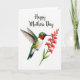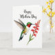 Designed with a bright white background, this card features a tiny bird hovering mid-air with wings stretched wide, as if leaning in with gentle affection toward a spray of flowers ❤️. The bird’s head and back are shaded in rich emerald green, while a small ruby-red patch glows at its throat like a warm blush. Its slim, dark beak points carefully toward long, coral-colored tubular blossoms that rise along the right side, creating a soft, romantic meeting point between bird and bloom. A green stem and fresh leaves support the flowers, adding a calm garden feel with a touch of springtime 🌼. Near the top, the words “Happy Mothers Day” sit centered in dark lettering, standing out clearly against the open space. The layout leaves plenty of white space around the artwork, drawing your eye to the tender near-touch between the hovering bird and the flower tips. Subtle shading gives the feathers and petals a gentle, painted look without heavy outlines. The coral blossoms form a vertical column on the right, with layered green leaves fanning outward beneath them.