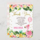 Sweet aloha or flamingo themed birthday thank you card featuring a mix colored floral arrangements with tropical flowers and foliage, a faux gold glitter calligraphy heading and a cute pink flamingo and balloon.