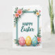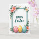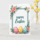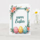 This design shows a white background with a calm teal rectangular frame centering the layout, creating a tidy space that feels like an invitation shared between close friends 🌷. Inside the frame, a short holiday greeting sits in dark teal, with one line in a clear, easy-to-read print style and a second line in a flowing cursive-like style for contrast. Leafy green sprigs and soft blossoms gather at the corners, mixing blush pink and creamy ivory petals with small yellow centers, like bouquets placed with quiet care. A few tiny buds in pale pink and warm amber peek out among the leaves, adding the look of early spring and gentle affection 🐇. The flowers and foliage appear to tuck slightly behind the border, with faint shadows that give the corners a light layered depth. Along the bottom edge of the frame, three egg-shaped decorations rest side by side in pastel rose, lemon, and sky blue, suggesting a sweet shared tradition. Each egg carries small starry floral shapes in white or yellow, and the teal border remains crisp against the open white space.