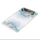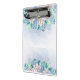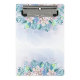 A clipboard with a floral design is displayed in a well-lit, close-up shot. The clipboard is predominantly white with a watercolor-style floral pattern adorning the top and bottom edges. The flowers are rendered in soft pastel shades of pink and green, with delicate details suggesting a hand-painted effect. The metal clip at the top is silver and appears new, contrasting with the gentle, organic feel of the floral design. The background is a gradient of light blue and white, giving the impression of a soft, diffused light source. The overall style is clean and modern, with a touch of whimsy from the floral elements. The image is likely intended for product display or promotional purposes.