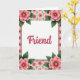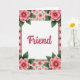 A heartfelt greeting card features a bright white rectangular center framed by layers of pink flowers and leafy greens, setting a gentle, affectionate tone ❤️. Around the edges, small star-shaped pink blossoms repeat in a tidy pattern, with fresh green leaves weaving between them like a garden border. In each corner, large pink blooms lean inward, their overlapping petals and broad leaves reaching slightly into the white space as if closing in for a friendly embrace. The petals shift from deeper rose near the middle to a softer blush at the tips, and tiny yellow details at the center add a sunny touch 🌼. The overall look feels like two friends sharing a quiet, caring moment, suggested by the way the corner flowers angle toward the center and meet the eye. Centered on the white panel is the word “Friend,” written in a flowing cursive-style lettering in warm rose, with plenty of open space around it for balance. The text sits squarely in the middle, surrounded by the floral frame that keeps the focus on the message without crowding it. The outer border shows repeating star-like pink blossoms against green foliage, while the four large corner flowers overlap the frame and the white panel.