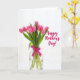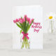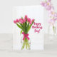This card features a cluster of deep pink, tightly closed flower buds filling the left side, arranged like a thoughtful gift offered with quiet affection ❤️. The blooms sit in a clear glass vase where slender green stems are visible through the water, catching soft highlights that feel calm and intimate. Around the neck of the vase is a fuchsia ribbon with small white polka dots, tied into a tidy bow that adds a sweet, friendly touch 🌼. The background is plain white with gentle, diffused daylight that keeps the scene airy while letting the greens and pinks stand out. On the right side, the words “Happy Mother’s Day!” appear in a flowing, cursive-style font, colored in a rosy pink that matches the flowers. The text sits with comfortable spacing, balancing the bouquet so the layout feels like a warm exchange between the arrangement and the message. Subtle reflections shimmer along the vase edge, and the petals show soft shading from darker pink at the base to lighter tips. The bow’s loops and tails angle slightly outward, with crisp white dots scattered evenly across the ribbon.