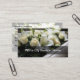 Modern floral theme funeral home business cards presented for a Funeral Director or Funeral Officiant created with a beautiful lily flowers and roses on a coffin graphic lightly printed as a background behind your editable text on both sides.