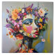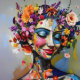 "Floral Geometry" – A Botanical Portrait. An intricate meeting of angular mosaic-like design and lush floral abundance defines this work. The woman’s piercing gaze contrasts with the softness of blossoms, creating a balance between precision and chaos. A vivid palette of pinks, yellows, purples, and reds highlights the connection between the structural and the organic, yielding a modern, unforgettable portrait.