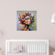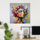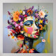 "Floral Geometry" – A Botanical Portrait. An intricate meeting of angular mosaic-like design and lush floral abundance defines this work. The woman’s piercing gaze contrasts with the softness of blossoms, creating a balance between precision and chaos. A vivid palette of pinks, yellows, purples, and reds highlights the connection between the structural and the organic, yielding a modern, unforgettable portrait.