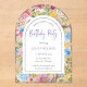 Floral Arch Frame Birthday Acrylic Invitations with pretty wild country flowers in purple, lavender, green leaves and more, with an elegant editable background suit for girls' birthdays for any age.