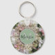 A gold decorative hexagon gold mandala on a backdrop of colorful bouquet of white, yellow, pink flowers. In the center can be personalized on a green sphere with name, phrase, letter or logo.