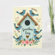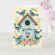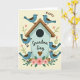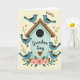 This card shows a rustic light-blue birdhouse as the main focus, surrounded by six round little birds with blue bodies, warm brown wings, and tiny legs. Two birds sit close together on the slanted, wood-textured roof, their gentle lean suggesting a sweet bond ❤️. The others gather near the base among soft pink blossoms and leafy green stems, like friends tucked into a cozy garden corner. A calm cream background keeps the scene airy while letting the blues, browns, and blush tones stand out. Light texture marks on the birdhouse and feathered wings add depth without making the artwork feel busy. The word “Happy” appears above the illustration in a curved line, and “Grandma Day” is placed across the birdhouse in a darker, flowing letter style. Near the bottom of the birdhouse, a small brown heart sits just above the flowers 🌼.