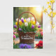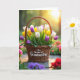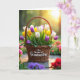 This card shows a sunlit garden moment centered on a rustic woven basket resting on a textured stone path. The basket spills over with cupped flowers in crisp white, sunny yellow, and deep purple, tucked into fresh green leaves that feel like an affectionate offering ❤️. Behind it, the scene fades into a softly blurred wash of greens with faint hints of distant blooms, like a quiet place meant for close conversations. Warm golden light drifts in from the upper right, giving the petals a gentle glow and adding a tender, caring mood to the arrangement. The message “To a Wonderful Grandmother” appears in white lettering placed directly on the basket’s front, standing out against the natural brown weave. The stone path beneath shows small speckles of light and shadow, as if sunlight is filtering through nearby branches 🌼. In the upper background, the greenery melts into a smooth haze with soft circular highlights.
