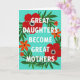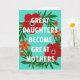 This card features a bright teal background with a floral wreath that wraps around a mother-and-daughter message, creating a cozy, close-knit feel ❤️. Centered in the middle, large white sans-serif lettering reads “GREAT DAUGHTERS BECOME GREAT MOTHERS” in all caps. The words are framed by two large red, anemone-like flowers whose petals spread outward like an embrace, each with a dark speckled center ringed by tiny white dots. Smaller orange blossoms are scattered around them, adding little sparks of warmth like friendly glances shared across the room 🌼. Deep green leaves curl and weave through the wreath, their flowing shapes softening the strong geometry of the text and suggesting gentle care. Thin dashed horizontal lines sit above and below the main phrase in a subtle gray-green tone, guiding the eye without stealing attention. The wreath forms an oval around the message, with the two red flowers positioned left and right and the orange flowers tucked between the leaves.