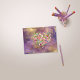 Romantic heart shape floral arrangement with gold, antique handwriting overlay over an abstract, pink, lavender purple, and gold paint wash.