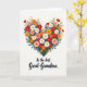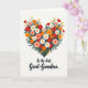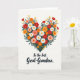 This greeting card features a heart-shaped arrangement of flowers and leafy stems at the top, shaped with careful edges that suggest affection and closeness ❤️. The heart is packed with layered blooms in deep reds, warm oranges, soft coral pinks, bright whites, and small touches of golden yellow 🌼. Rounded blossoms and many-petaled flowers sit side by side, creating a gentle rhythm like two friends leaning in to share the same space. Dark green leaves and thin stems trace the outline of the heart, adding contrast and helping the shape stand out. The background stays light and softly toned, letting the floral heart feel like the main focus under bright, even lighting. Below the artwork, the message “To the best Great-Grandma..” is placed near the lower center in a flowing, cursive-style font, colored in a darker shade for easy reading. The words sit with generous open space around them, balancing the dense bouquet above without crowding the page. Tiny yellow blooms are tucked between white petals and dark green leaves along the inner curve of the heart.