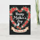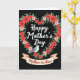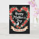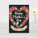 Designed with a deep black background, the front centers on a heart-shaped wreath made of red and blush-pink flowers nestled among curling green leaves. Petals show fine texture and darker dotted centers, giving the blooms a tender, close-up feel that reads like a gentle embrace ❤️. A small bird in soft blue and creamy white rests along the lower curve of the wreath, its orange beak angled as if quietly keeping someone company. In the middle of the heart, the words “Happy Mother’s Day” appear in flowing white lettering, placed prominently so the message stands out against the dark space. Just below, a muted cream banner stretches across, carrying “Mother-in-Law” in warm sienna-colored lettering with a slight shadow for depth. Tiny specks of white and pale gold are scattered around the wreath like soft glints, adding a calm, celebratory shimmer 🌼. The bird sits at the bottom edge of the floral heart, facing slightly upward toward the center text.