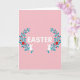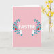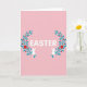 Designed with a soft pastel pink background, the design feels light and affectionate, like a quiet note shared between close friends. In the center, large white capital letters spell out a festive Easter message, standing out clearly against the pink. On both sides, matching botanical arches curl inward, guiding your eye toward the words as if they’re leaning in together. The arches are filled with teal leaves and scattered red heart-shaped berries and red flowers, adding a romantic touch through their paired, mirrored placement 🌷. Small pale blossoms are tucked among the leaves, giving the greenery a gentle, springlike texture. At the bottom of each arch sits a white long-eared bunny silhouette in profile, both facing inward like they’re meeting in the middle 🐇. The message text sits centrally while the decorative arches frame it evenly, with all lettering kept in bright white. The two bunnies have tiny curled tails and are positioned symmetrically beneath the leafy arches.