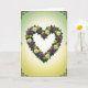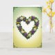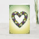This design shows a heart-shaped wreath of flowers centered on a softly glowing background, like a gentle spotlight on a shared moment. The heart is packed with deep purple, white, and sunny yellow blossoms, each with a contrasting center, and the petals overlap in a way that feels like two friends leaning in close. Green leaves and small sprigs weave between the blooms, giving the heart a full, layered texture that reads as affectionate and welcoming 💚. Behind it, the backdrop fades from muted green at the top to warm yellow at the bottom, with a pale halo that makes the heart stand out. There’s no main message across the center; instead, the open space inside the floral heart leaves room for your own words, while the only lettering would sit best above or below in a dark green tone to match the foliage ☘️. A decorative border frames the scene, with dark filigree curls in each corner and a repeating line of stylized green motifs running along the edges. The corners show ornate, dark flourishes, and the edge pattern repeats in small green shapes around the full frame.