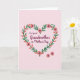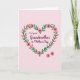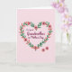 This card features a symmetrical heart shape formed from slender, curling vines, dotted with coral blossoms that have deep violet centers for a tender, romantic contrast ❤️. Two tones of leaves—fresh green and soft coral—alternate along the vines, giving the heart a gentle, intertwined look like a quiet embrace. The background is a smooth blush pink, keeping the focus on the floral heart and its cozy, affectionate mood. Centered inside the heart is a short message in flowing maroon lettering, placed neatly so it feels cradled by the vines. The letterforms are slightly slanted and airy, adding a soft, intimate feel without crowding the design. Subtle pastel shading suggests a calm, even light across the whole scene, like a peaceful morning glow 🌼. Near the lower right area, two smaller matching flower clusters appear as decorative accents, echoing the main heart. The extra blossoms sit just outside the heart’s edge, with the same coral petals and violet centers against the pink backdrop.