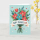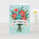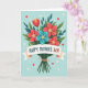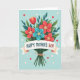 This card features a cheerful floral bouquet as the main focus against a soft, calm blue background. Scarlet and teal blossoms with bright yellow or white starburst centers nestle together with broad deep-green leaves and slimmer dark-teal sprigs, creating a cozy, close-knit look that feels like a warm hug ❤️. A single orange-red tulip-shaped bloom rises above the cluster, adding a gentle sense of admiration, like someone standing a little taller to show love. The stems are gathered neatly at the base and tied with a knotted brown twine for a simple, rustic touch. Across the middle, a cream ribbon stretches horizontally, carrying the words “HAPPY MOTHER’S DAY!” in strong, easy-to-read lettering. The message sits centered on the ribbon, standing out clearly against the pale band while the bouquet fills most of the space behind it. Small red hearts and a few faint, translucent circles float around the bouquet in the blue background, like little notes of affection 🌼.