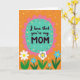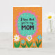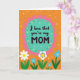 This design shows a large teal oval framed by scalloped pink petals, like a sunny blossom, setting a sweet, close-to-the-heart mood ❤️. Centered inside, the words “I love that you’re my MOM” sit in dark lettering, with “MOM” in uppercase and the rest in a flowing letter style. Behind it all, a warm orange background is sprinkled with tiny dot confetti in white, yellow, and pink, adding a light, celebratory feel. The gentle mix of soft curves and bright color makes the message feel like a warm hug between close family. Along the bottom, a row of simple garden flowers grows upward, suggesting a caring bond that’s been tended over time 🌼. White blooms with yellow centers show faint radial lines, while nearby blue flowers keep smooth yellow centers for contrast. Green stems rise from the base with small white dots scattered along them, and the orange field remains dotted all around the central flower shape.