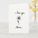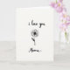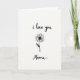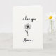 This card shows a simple black line drawing of a flower centered on a bright white background, with lots of open space that feels calm and intimate ❤️. The bloom has many thin petals circling a solid dark center, like a quiet focus point that draws you in. A slim stem drops straight down, and one small leaf leans off to the side, adding a gentle, slightly shy motion. Near the top, the words “i love you” sit above the flower in loose, handwritten-style lettering in black. Below the stem, “Mama” appears in the same black lettering, placed low and centered, like a soft reply. The strong black-on-white contrast keeps everything clear while the tender pairing of the two lines of text feels like a close, affectionate exchange 🌼. The petals radiate evenly around the dark center, and the single leaf angles outward on the right side of the stem.