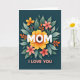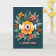 This design shows a lush floral arrangement set against a deep, calm dark teal background, with a large many-petaled flower glowing in golden yellow at the center. Around it, sweeping leaves in forest green and muted sage curve like an embracing frame, suggesting a close, caring bond. Small five-petaled blossoms in soft coral-pink nestle between the leaves, adding a gentle, friendly warmth 🌼. Here and there, warm orange leaf sprigs and tiny crimson berry-like dots add little sparks of attention, like affectionate gestures shared in passing ❤️. Across the middle of the golden flower, the word “MOM” appears in thick white letters with a faint shadow that helps it stand out from the petals. Beneath that, “I LOVE YOU” sits lower in coral-pink lettering, centered and easy to spot. The final look features crisp edges and smooth shading on the leaves and petals, with coral flowers tucked near the lower sides of the central bloom.