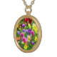 This artistic, decorative necklace is covered with masses of flowers in every color of the rainbow. Enjoy the yellow, orange, pink, red, blue, purple and white floral pattern set on a background of green leaves. When viewing this, one is reminded of a French Impressionist painting.