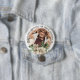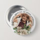 An enchanting button for friends and family to wear at a funeral or memorial service featuring a photograph of your loved one and the words "IN LOVING MEMORY OF", their name and a watercolor bouquet of white roses and eucalyptus greenery.
