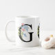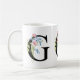 A personalized coffee mug with the letter "G" monogram, featuring decorative watercolor floral and foliage illustrations. Easily customize it with your name or create a unique gift for your loved ones.
