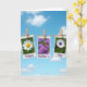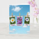 This greeting card features three floral photo-style frames hanging from a rustic twine line, clipped in place with small wooden pins against a wide blue sky with soft white clouds. The left frame shows a white daisy with a sunny yellow center, set over a gently blurred green field that feels like a quiet walk together 🌼. In the middle frame, an orange-and-black winged insect rests on clustered purple blossoms, as if pausing close to admire something beautiful side by side. The right frame presents another white bloom with a deep indigo-purple center, echoing the purple tones in the middle image for a sweet, connected look. Below the frames, a short message sits centered near the bottom in purple lettering, adding a gentle romantic touch ❤️. Each frame hangs at a slight angle, like photos casually displayed after a day spent outdoors. The twine stretches horizontally across the upper portion, with the three frames evenly spaced beneath it and the clouds drifting behind them.